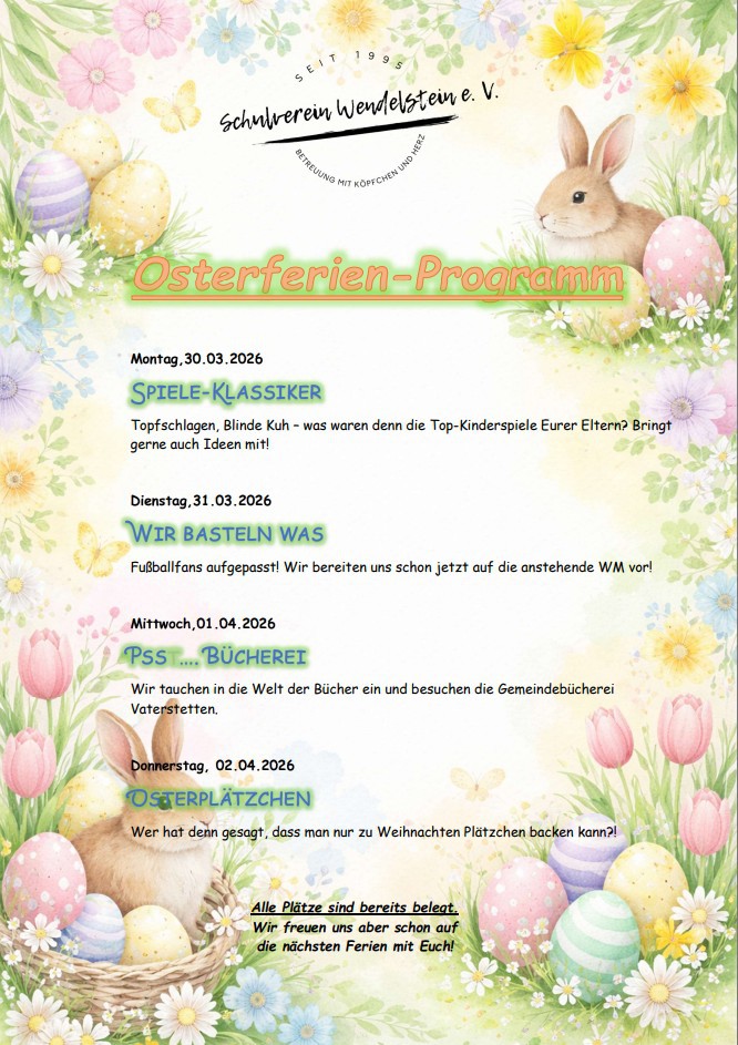 Die Anmeldungen für die Osterferien in unserer Ferienbetreuung sind nun abgeschlossen.
